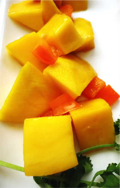 - Whisk the dressing and pour over the mangoes and peppers.Your salad is ready.