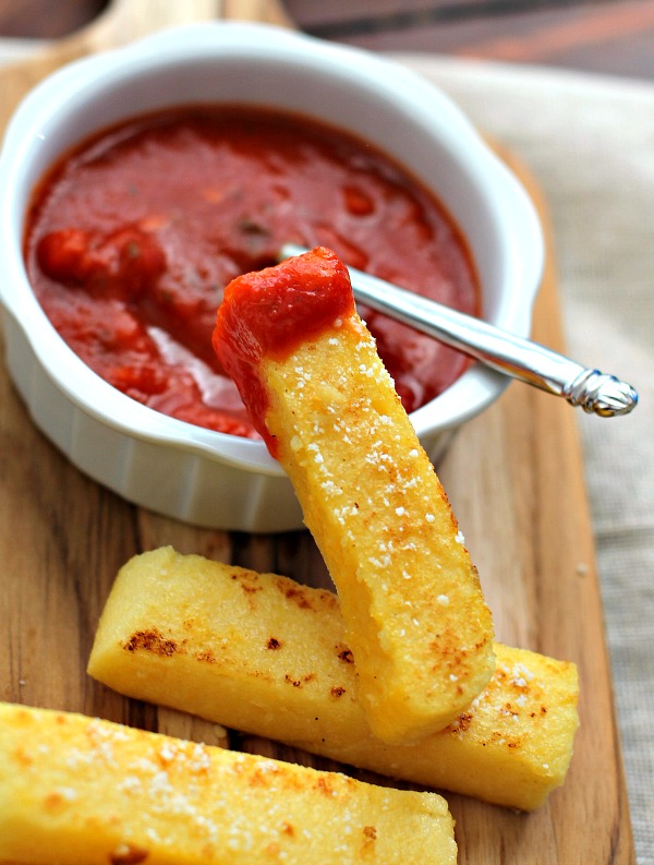 - Working in batches, fry the polenta pieces until golden brown on all sides, about 3 minutes per side. Using tongs, transfer the polenta pieces to paper towels and drain.Serve warm along with some store bought marinara.